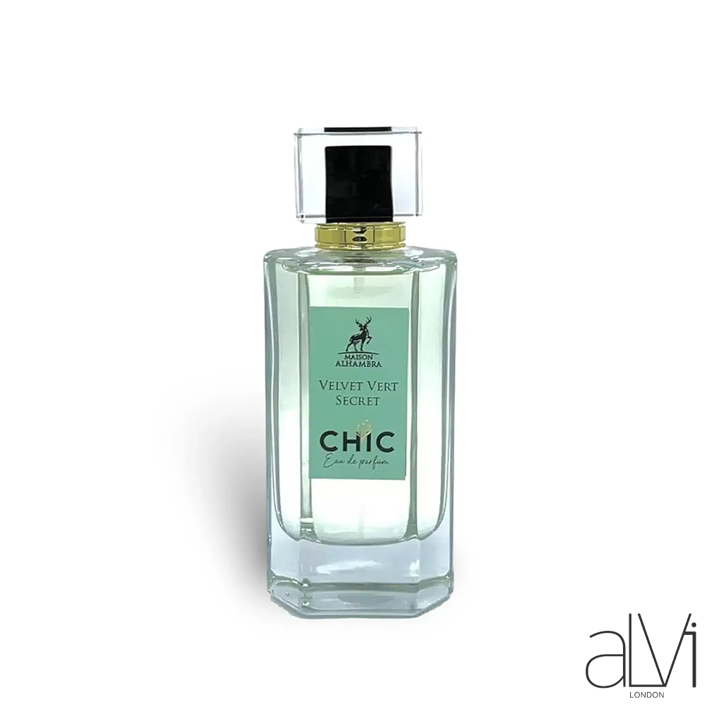 Chic Very Velvet Vert Secret Eau de Parfum is a refined unisex fragrance, blending green, woody, and oriental notes for a fresh yet sophisticated long-lasting scent.