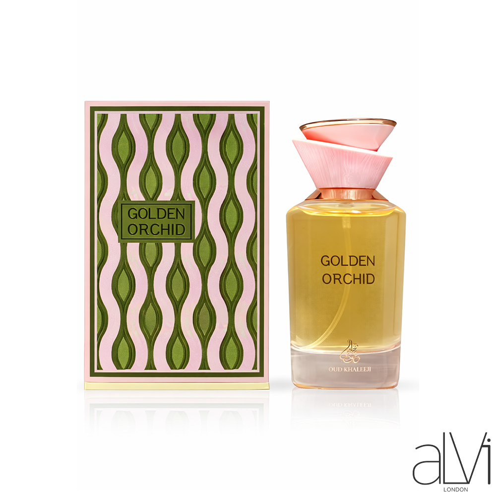 Golden Orchid 100ML by Oud Khaleeji is a sweet floral-gourmand fragrance featuring orchid, tangerine, tropical fruity notes, vanilla, and musk. A smooth, elegant, and long-lasting scent perfect for everyday wear or special occasions.