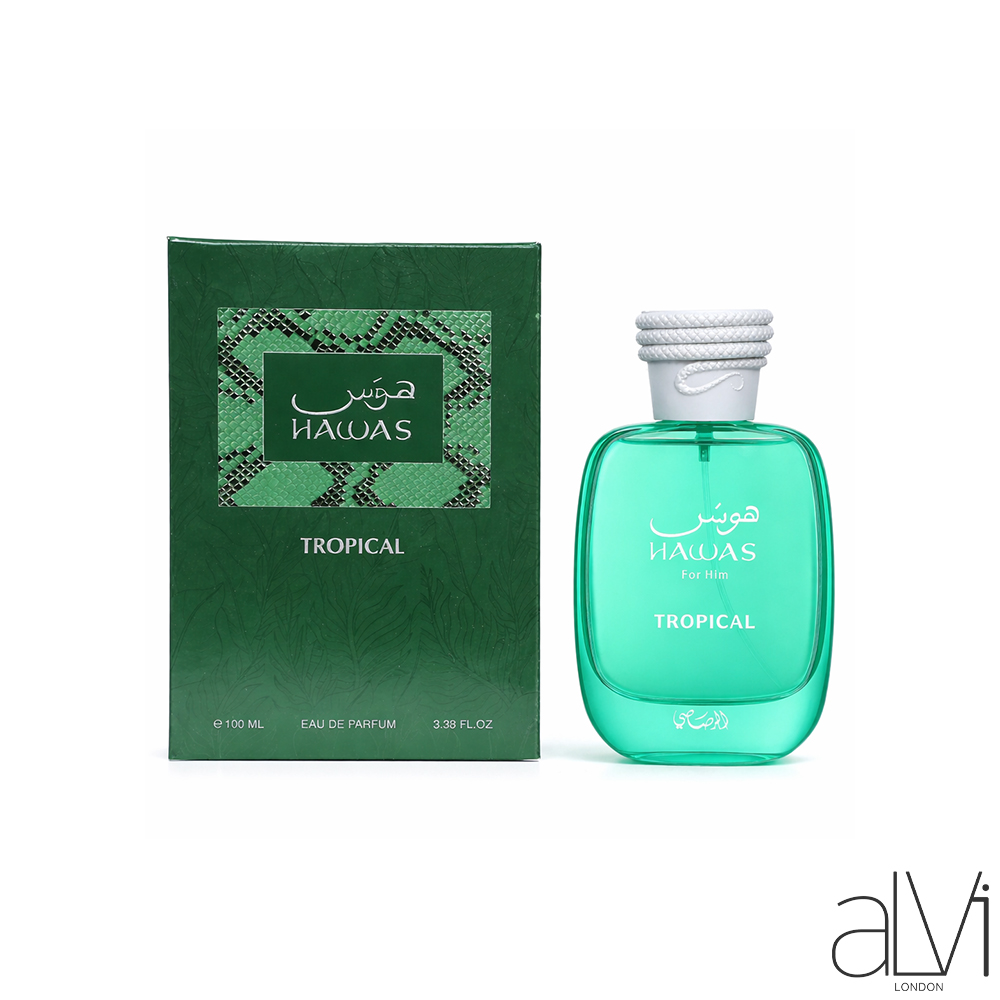 Hawas Tropical 100ML by Rasasi is a fresh tropical fragrance featuring notes of coconut water, fig, mint, sandalwood, tonka bean, and musk. This vibrant Eau De Parfum delivers a smooth, refreshing, and long-lasting scent perfect for everyday wear and warm weather.