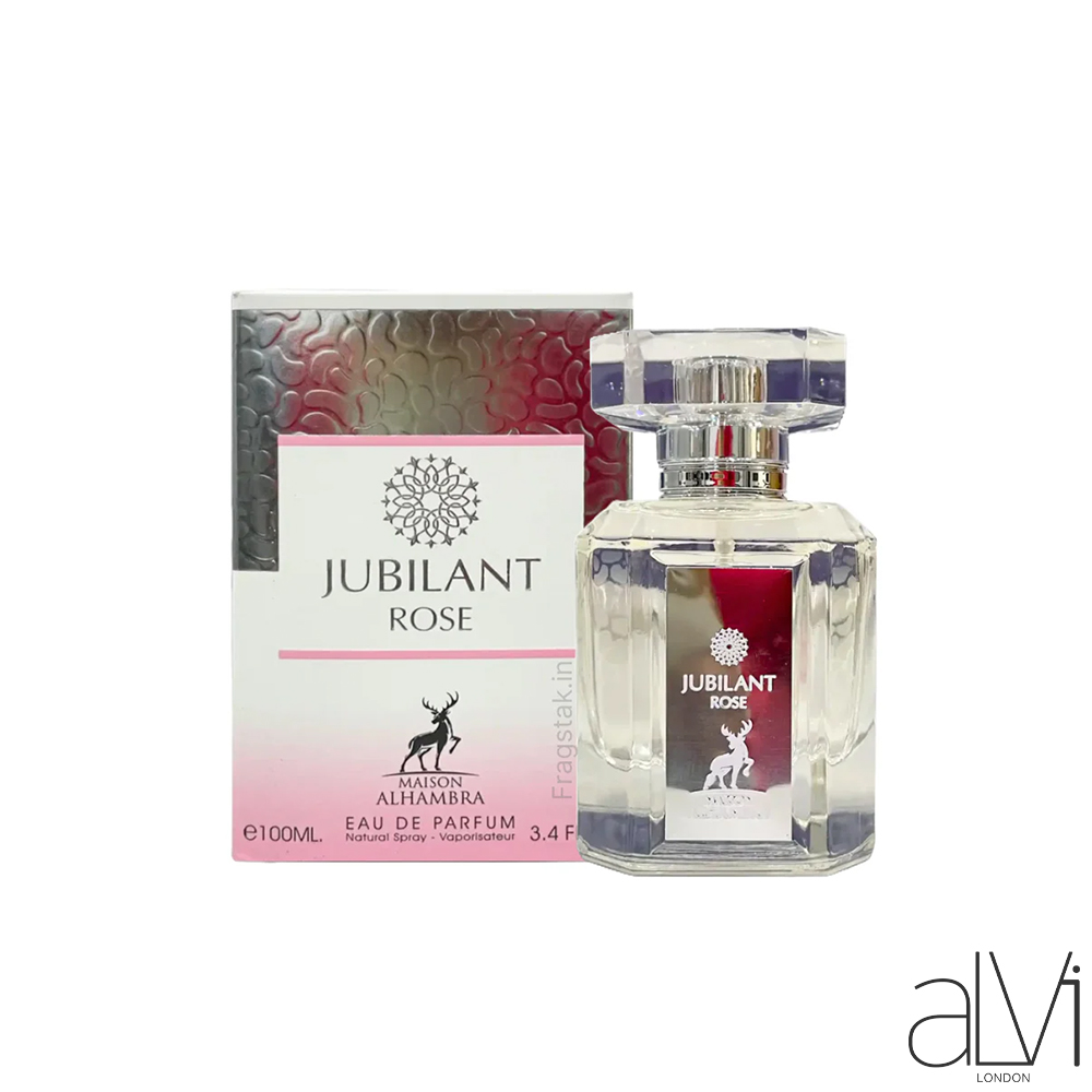Jubilant Rose Eau de Parfum is a refined unisex fragrance, blending velvety rose with amber, musk, and woods for a luxurious, long-lasting scent.